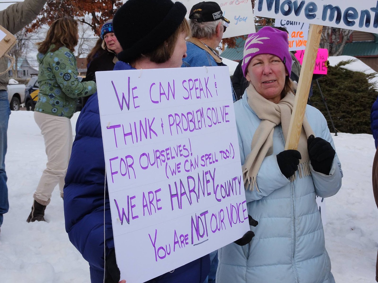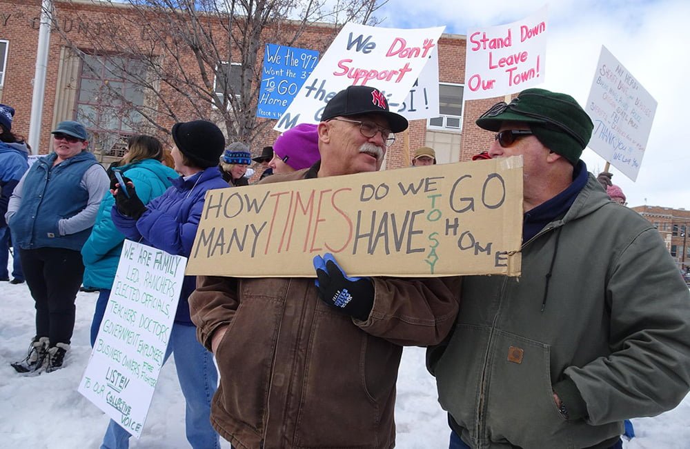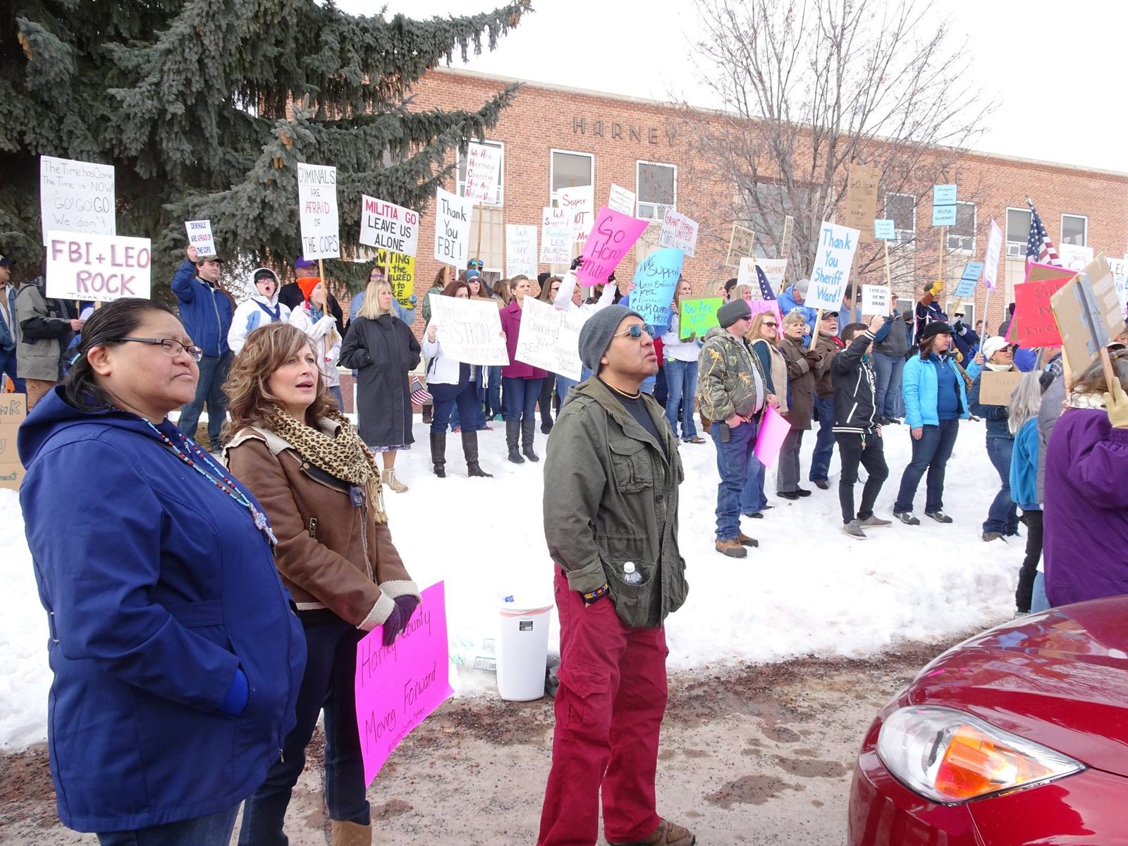 As part of that call to action, on February 1, the Three Percenters rallied around 250 people outside the Harney County Courthouse. Unlike the January Three Percenter rally in Burns, this time the Three Percenters were greeted by a counter-demonstration of more than 350 people who came out in support of law enforcement and to tell the Three Percenters to “go home!”